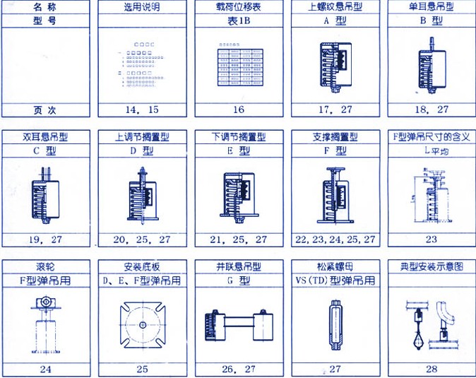 (一)、用途和适用范围: 可变弹簧支吊架按安装方式的不同,分为A、B、C、D、E、F、G七种型式。