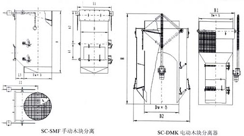 | 木块分离器是制粉系统中的重要部件之一,由于电厂来煤不是很纯,进入磨煤机的原煤往往夹带有木块、麻袋、稻草等杂物,在磨煤机内不易被粉碎,通过磨煤机后,往往堵在粗分离器回粉管道里或制粉管道拐弯处,严重影响制粉系统的正常运行,为了提高制粉系统运行的经济性和安全性,需要在磨煤机出口加装木块分离器。 木块分离器分为手动和电动两种型式。 SC-SMK系列手动木块分离器共有八个规格,SC-DMK系列电动木块分离器有五种规格,都是较为成熟的定型产品